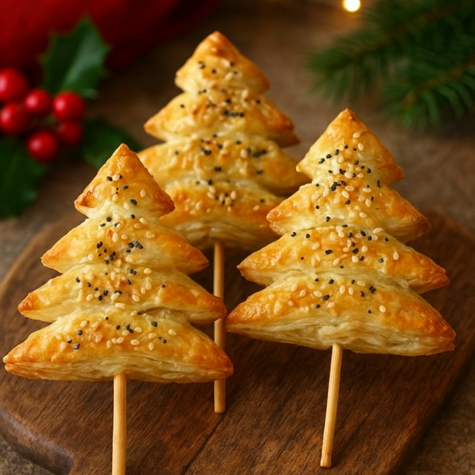 Pinta cada árbol con huevo batido y espolvorea semillas de sésamo o amapola. Hornea a 180 °C durante 10–12 minutos, hasta que estén dorados y crujientes.