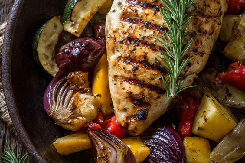Un plato fit de pollo a la plancha con verduras asadas y aromas mediterráneos. Sano, fácil y con la esencia cálida de un hogar rústico español.
