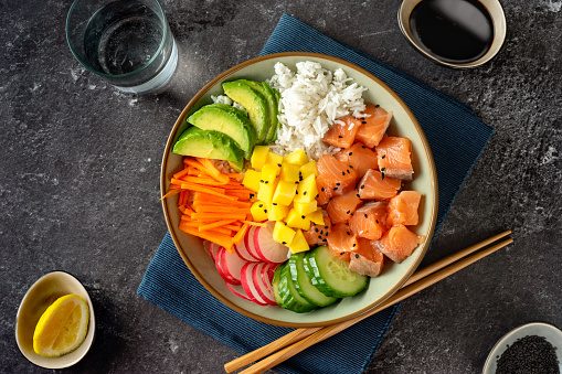 Coloca salmón, aguacate y pepino formando pequeños montículos en un bol.