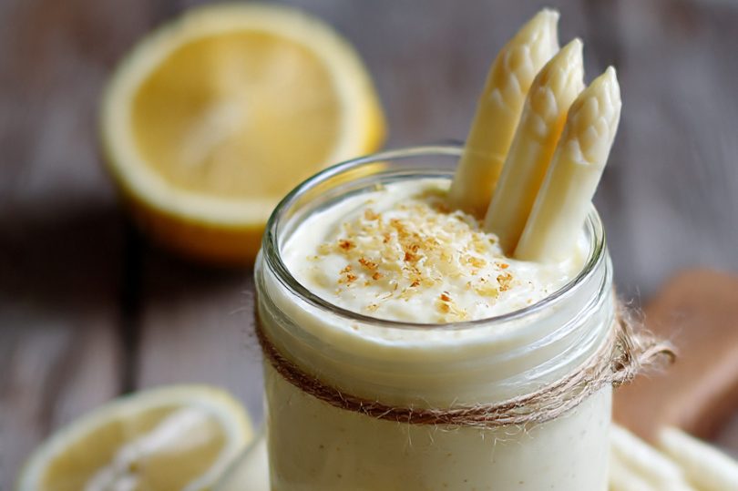 Tritura espárragos, yogur, limón rallado, zumo, aceite y pimienta hasta obtener una crema muy fina.