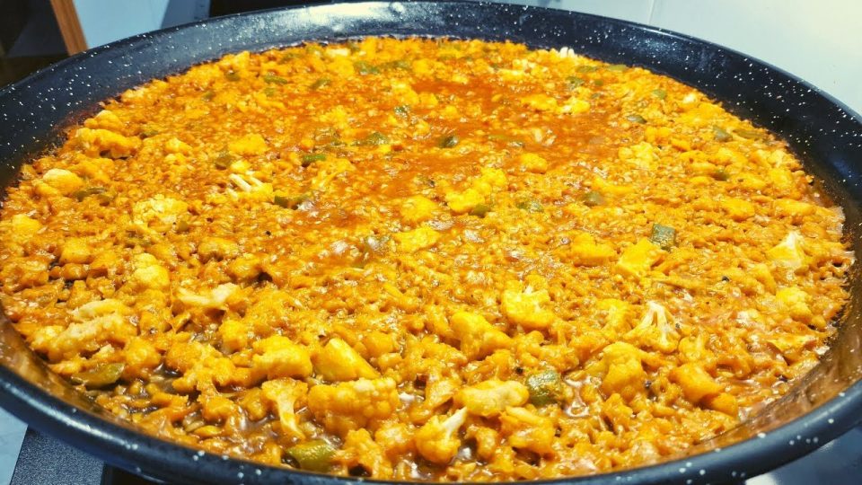 prende a preparar una paella de coliflor con bacalao, ligera, saludable y llena de sabor. Receta fácil, paso a paso, ideal para los amantes de la cocina española saludable.